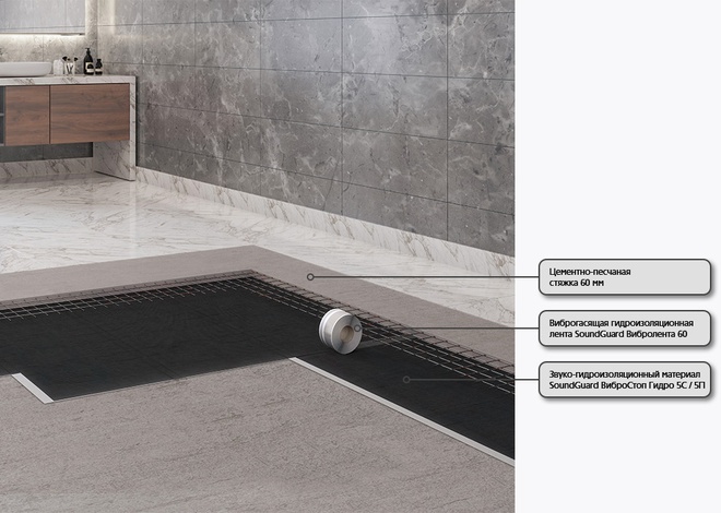 Система звукоизоляции пола под стяжку для помещений с повышенным уровнем влажности. Отлично изолирует шум бытовых приборов, крики, лай собак, шаги, падение и передвижение предметов. Применяется в ванных и душевых комнатах, помещениях с бассейнами, саунах, и т.д.